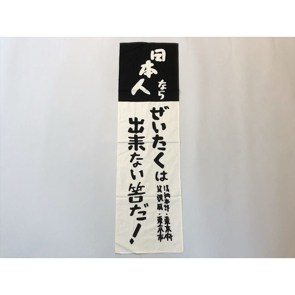 商品は、日本人ならぜいたく出来ない筈だの布製レプリカ1点です。 サイズ 約97×28センチ ◆詳細 長期戦と物資不足が懸念されていた日中戦争及び太 平洋戦争(大東亜戦争)に於いて、国民の戦意昂揚の ため、「贅沢は敵だ!」「日本人なら贅沢は出来ないはずだ!」「欲しがりません勝つまでは」「足らぬ足らぬは工夫が足らぬ」「遂げよ聖戦 興せよ東亜」「聖戦だ 己れ殺して 国生かせ」「石油の一滴、血の一滴」「全てを戦争へ」などの戦時標語を掲げて、国民に理不尽な耐乏生活を強いました。この頃には、飯の真ん中に梅干しを1個乗せただけの「日の丸弁当」奨励、「パーマネントはやめましょう」、国民服やモンペ姿を男女の制服として推奨した教化運動なども叫ばれました。